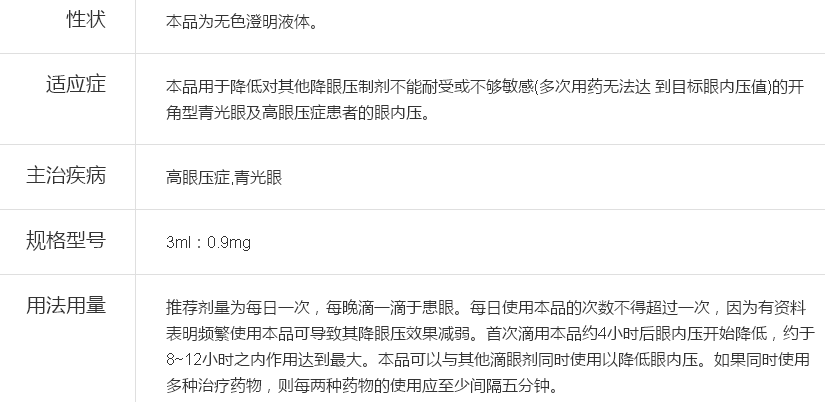 适应症:用于降低开角型青光眼或高眼压症患者的眼压;