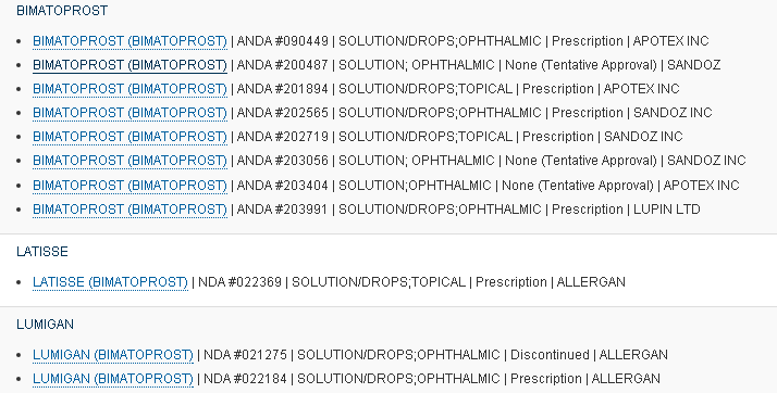 比马前列素目前批准上市的共有两个品牌,分别是Lumigan和Latisse。Lumigan被认为是目前降IOP作用最强的局部抗青光眼药物。Latisse则是全球唯一获得FDA认证的睫毛增生液。2010年8月,美国FDA批准了Allergan有限公司开发的0.01%比马前列素(bimatoprost)滴眼液Lumigan0.01%,随后0.03%退市。