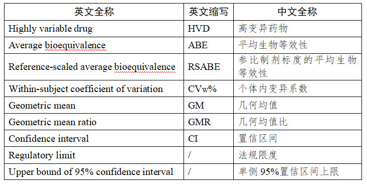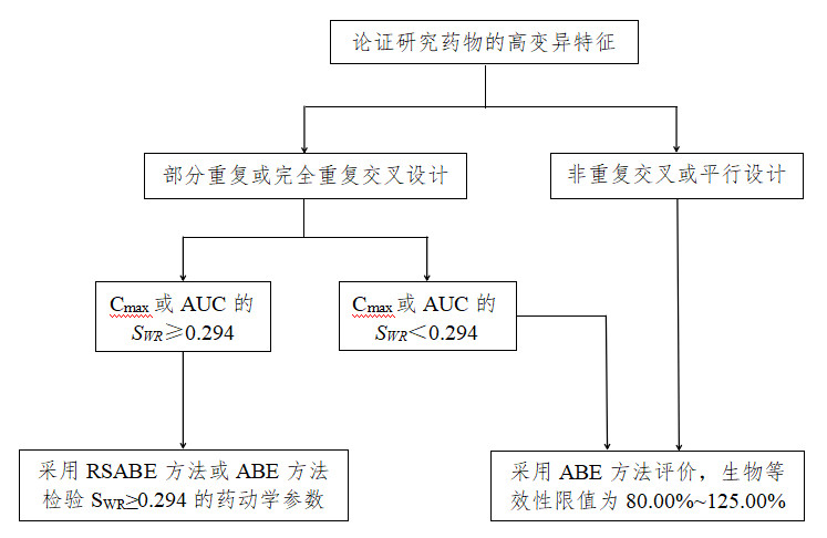 对于安全性较好、治疗窗较宽的高变异药物,在充分科学论证的基础上和保证公众用药安全、有效的前提下,通过部分重复或完全重复交叉设计,根据参比制剂的个体内变异,采用参比制剂标度的平均生物等效性(Reference-scaled average bioequivalence, RSABE)方法,将等效性判定标准在80.00%~125.00%的基础上适当放宽,可减少不必要的人群暴露,达到科学评价不同制剂是否生物等效的目的。