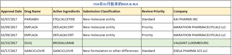 在刚过去的2月里,FDA共批准了4个新药申请(NDA)、1个生物制品申请(BLA)及45个仿制药申请(ANDA,不含6个预批准药物),其中包括了5个首仿药,后有详细清单。