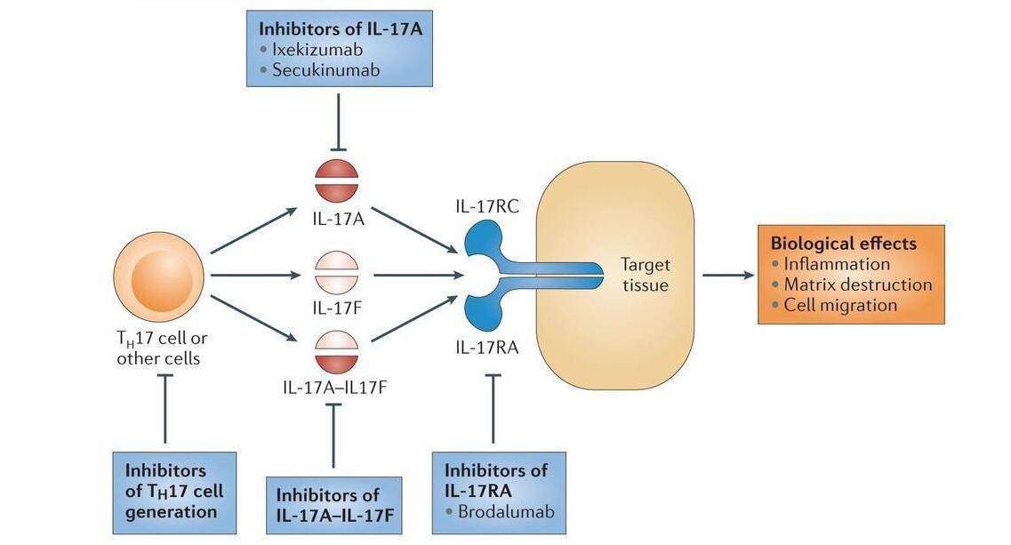 白细胞介素17 (IL-17)在1993年首次被科研人员发现,随后的研究发现IL-17在宿主防御、自身免疫性疾病发病以及肿瘤中发挥重要的作用。迄今为止,己有六个IL-17家族成员被发现:IL-17A、IL-17B、IL-17C、IL-17D、IL-17E和IL-17F,IL-17是IL-17家族的原型。Siliq的活性成分Brodalumab是一种新颖的IL-17受体的抑制剂(单克隆抗体),能选择结合IL-17受体并阻止其与IL-17A、IL-17F及其它类型IL-17的结合,避免机体收到可能导致炎症的信号,从而抑制银屑病相关炎症的应答反应。