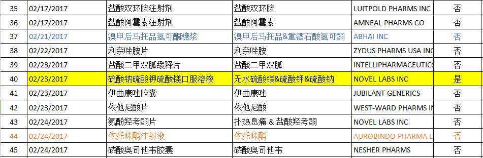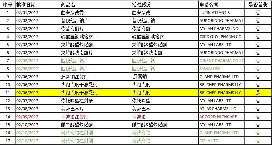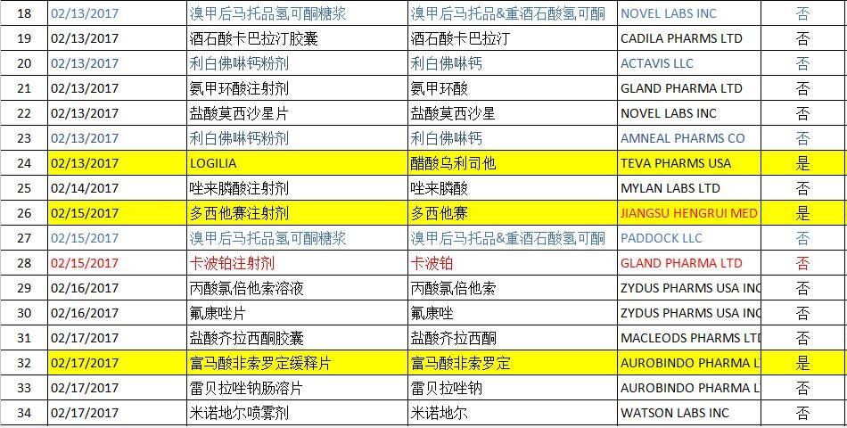 2017年02月FDA共批准ANDA药物有45个(后面附详细图表),其中印度Aurobindo公司为大赢家,有5个产品获得批准,其中1个为首仿产品;迈兰(MYLAN)也有5个产品获得批准(无首仿产品),数量与Aurobindo持平。溴甲后马托品氢可酮糖浆获得批准的公司最多,达到3个;利白佛啉钙粉剂、奥沙利铂注射剂、卡波铂注射剂、匹伐他汀钙片、依托咪酯注射液均有两个公司获得批准;其余产品均只有一个企业获得批准。
