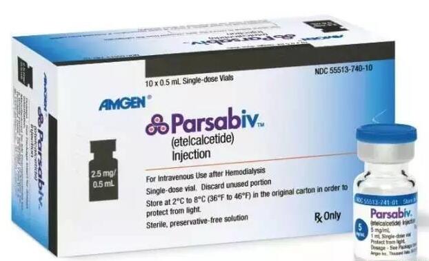 Parsabiv为FDA于2017年02月07日批准的用于治疗血液透析慢性肾脏病(CKD)成年患者继发性甲状旁腺功能亢进(sHPT,简称继发性甲旁亢),是一种拟钙剂,活性成分为Etelcalcetide,是首个在每次透析结束时可通过静脉注射给药的拟钙剂,批准规格为2.5mg/0.5ml、5mg/ml和10mg/2ml,被批准公司为KAI PHARMS INC(于2012年以3.15亿美元被Amgen收购)。该产品曾于2016年08月被FDA否决,却于2016年11月11日获得欧洲药品管理局(EMA)人用药品委员会(CHMP)的批准上市(Amgen Europe B.V.),最终又于本月07日获得FDA的批准。Parsabiv是安进(Amgen)公司第二个重磅级用于治疗透析CKD患者的继发性甲旁亢症的药物。