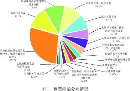 报告显示,经过对313个药品注册申请的现场核查报告进行分析,共发现5111条缺陷项。其中临床部分4583条,平均每个临床试验机构发现问题6条;生物分析部分528条,平均每个生物样本分析单位发现问题4.4条。依据《药物临床试验数据现场核查要点》对缺陷进行分类,发现缺陷条款数量最多的方面依次为:临床试验过程记录及临床检查、化验等数据溯源方面(占28.1%),方案违背方面(占12.0%),试验用药品管理过程与记录方面(占11.6%)和安全性记录、报告方面(占10.1%),共发现缺陷3161项,占61.8%(见图1)。