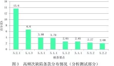 对分析测试部分现场核查发现的528项缺陷汇总分析,显现出频次最高的缺陷条款(见图3)。