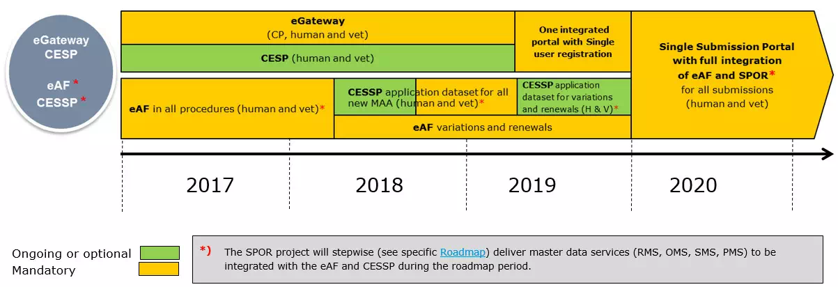 图2中显示的最新欧盟电子提交路径图版本2.0描述了单一提交门户的概念,该门户将通过集成当前CESP和EMA电子提交网关来创建。 欧盟远程信息处理管理委员会已同意使用当前的CESP门户建立此单一门户。 该未来系统目前被称为欧洲通用单一提交门户(CESSP)。