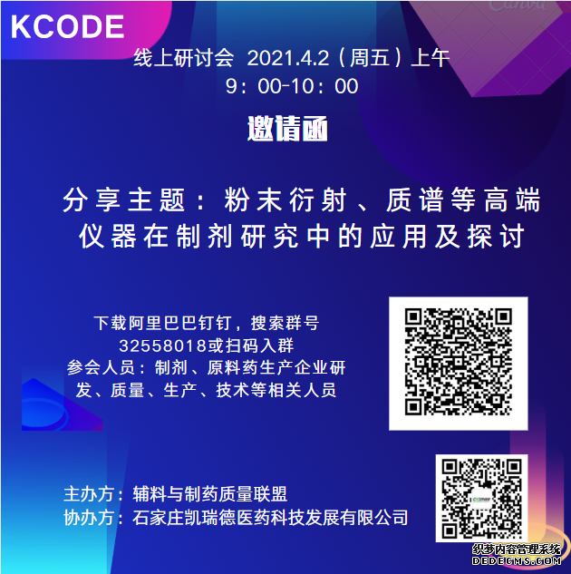国内药物高端仿制方兴未艾,借助粉末衍射仪、质谱、ICP-MS和AAS等仪器的特殊检测更是如虎添翼,ANDA研究及申报时如何善用、巧用、活用这些工具?本周五上午九点,辅料与制药联盟特约石家庄凯瑞德质谱中心的高级工程师曲老师做客辅料联盟群,为大家分享《粉末衍射、质谱等高端仪器在制剂研究中的应用及探讨》。曲老师专注于粉末衍射、质谱等高端仪器在制剂研究中的应用和开拓,将自己真实应用的点滴经验整理归纳,在线上与诸位进行交流研讨,请大家准时在群内收听收看,交流研讨。